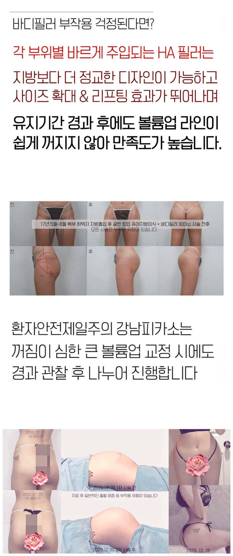 엉덩이와 골반의 볼륨을 적절하게 조절하는 것은 단순한 미용 그 이상입니다. 그러나 너무 많은 양을 주입하면 부작용이 발생할 수 있습니다. 엑스레이를 이용하여 개인의 골반 구조를 살펴본 후, 적당량을 고려하여 시술을 진행합니다. 엉덩이와 허벅지는 움직임과 압력을 많이 받는 부위이기 때문에 필러가 자연스럽게 자리잡도록 해드립니다.