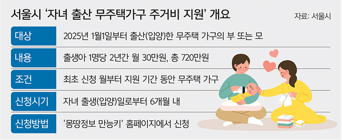 서울시는 2025년부터 아이를 출산하거나 입양한 노숙인 가구에 월 30만원의 주거비를 지원하는 정책을 시행한다. 이는 저출산 문제에 대응하기 위한 여러 정책 중 하나로, 해당 가구는 최대 2년간 총 720만원을 지원받을 수 있다. 지원을 받으실 수 있습니다. 최대 2년간 총 720만원 한도. 서울시의 주거비 지원. 본 정책은 서울시에 한하며, 지원 대상은 2025년 1월 1일 이후 자녀를 출산 또는 입양한 가구이다. 지원을 받으려면 부모 또는 자녀의 주민등록 주소가 필요하다. 서울시 내에 위치해야 하며, 세대의 주택이 전월세 7억원 이하, 월세 268만원 이하의 조건을 충족해야 합니다. 또한, 입양아의 경우 출생일로부터 48개월 이내이어야 합니다. SH, LH 공공임대주택 거주자는 지원 대상에서 제외됩니다. 단, SH, LH 공공임대주택 거주자는 지원에서 제외됩니다. 이미 정부가 공공임대주택 입주민들에게 시세보다 저렴한 가격으로 주거급여를 제공하고 있어 추가 지원이 필요하지 않기 때문이다. 이뤄지지 않을 것이라는 판단에 따른 것이다. 서울시 출산지원사업 주거비 부담으로 출산을 망설이는 가구나 수도권 외로 이사하는 가구를 돕기 위해 제정된 정책이다. 출산, 입양 가구라면 모두 부모의 소득이나 연령에 관계없이 지원받을 수 있어 많은 가구가 혜택을 받기를 기대하고 있습니다. 서울시 출산지원사업의 일환으로 서울시는 높은 주거비로 인해 결혼과 출산을 망설이는 청년들을 위한 출산지원사업의 일환으로 새로운 복지정책을 시행하고 있다. 2025년 1월 1일 이후 출산하는 무주택자에게 주거지원을 제공하는 제도다. 자녀 1인당 2년간 총 720만원, 월 30만원을 지원한다. 태아가 다태일 경우 태아 수에 비례해 지원금이 늘어나며, 2인 기준 월 60만원, 2년간 총 1,440만원을 지급받을 수 있다. 출생당 2년 월 30만원 : 총 720만원 다태아 2인 월 60만원 : 총 1,440만원 주거비 지원조건은 서울 전세 7억원 이하, 월세 286만원 (보증금에 따라 변동) 아래 임대가구에 한하며, SH, LH 공공임대(장기임대, 청년안심주택, 행복주택) 거주자는 제외됩니다. 또한, 지원기간 동안 무주택자 신분을 유지해야 하며, 주택 구입, 타 시·도로 이사 등 제외사유가 발생할 경우 지원이 중단됩니다. 서울시 주거비 지원 정책 신청 방법입니다. 신청은 모든정보유니버설키 홈페이지(umppa.seoul.go.kr)를 통해 할 수 있으며, 신청기간은 출산(입양)일로부터 6개월 이내이다. 보조금 지급 기간은 사전에 결정됩니다. 이런 과정을 거쳐 2025년 1월부터 시작될 예정이다. 서울에 거주하는 신혼부부의 노숙자 비율은 64%에 이르고, 그 중 절반 이상인 57.4%가 자녀가 없는 것으로 나타났다. 반면, 서울에 단독주택을 마련한 신혼부부는 무자녀율이 46.3%에 달하며, 높은 주거비가 출산을 기피하는 이유 중 하나로 꼽힌다. 이에 서울시는 난임부부, 임산부, 다자녀가정, 1인 자영업자 등 다양한 대상을 대상으로 한 저출산 대책을 지속적으로 추진해왔다. 이에 서울시는 학업과 취업을 위해 서울에 살던 청년들이 서울을 떠나 주거와 가족을 위해 경기·인천으로 이주하는 현상이 늘어나면서 저출산 극복을 위한 새로운 주거대책을 내놨다. 매년 증가하고 있습니다. 오늘. 이러한 내용을 담은 내년 1월부터 시행되는 서울시의 복지정책에 대해 안내해 드립니다. 무주택 가구 중 내년에 출산 예정인 가구도 이 혜택을 받을 수 있으니 참고하시기 바랍니다. 오늘은 서울시가 내년부터 추진하는 새로운 복지정책인 ‘출산지원서울사업’에 대해 알아봤습니다. 무주택 가구에 자녀 1인당 2년간 월 30만원을 지원하는 이 제도는 주거비 부담을 줄이는 데 도움이 된다. 이는 안도감을 제공하고 출산을 장려하기 위해 고안되었습니다. 출산을 앞둔 많은 가정에 큰 도움이 될 것입니다. 꼭 필요한 분들이 혜택을 받으실 수 있도록 신청방법과 자격조건을 잘 확인하시기 바랍니다. 서울시의 이러한 노력이 저출산 문제 해결에 조금이나마 보탬이 되기를 바랍니다.